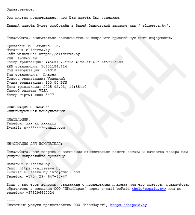 Обращаем ваше внимание, что после проведения платежа на указанный вами электронный адрес придет подтверждение оплаты. Просим вас сохранять данные оплат.